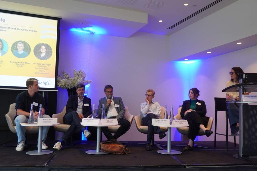 The speakers and panel were Ms. Annalisa Corrado, MEP S&D Italy; Mr. Michael Bloss, MEP Greens Germany; Ms. Nicolás González Casares, MEP S&D Spain ; Mr. Peter Liese, MEP EPP Germany, Mr. Samuel Butler Sloss, Manager – Ember Futures; Ms. Dr. Yara Van Ingen, Buildings Decarbonization Analyst – BloombergNEF. It was moderated by Jozefien Vanbecelaere, Policy Director at EHPA.